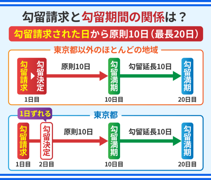 勾留の期間は原則10日、最長20日ですが、勾留の初日は勾留請求された日です。勾留が決まった日ではありません。通常は勾留請求された日に勾留が決まりますので、どちらを初日とカウントしても勾留期間は同じになります。
