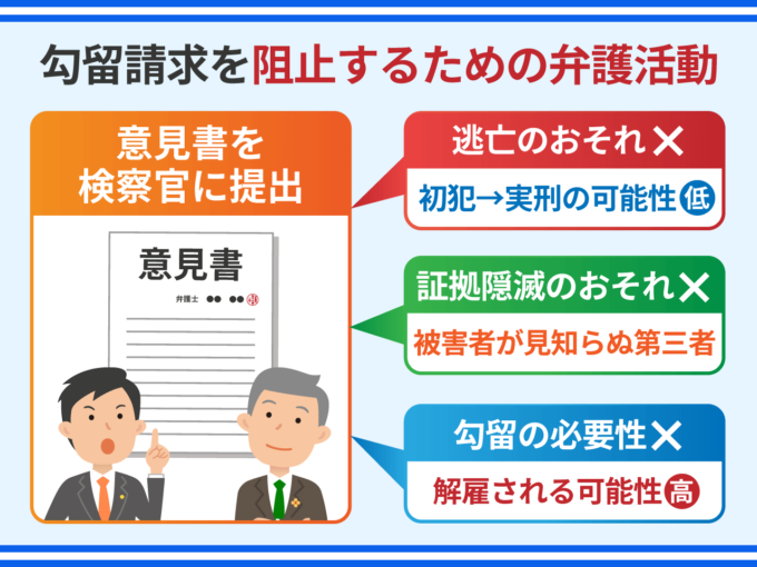 検察官が勾留請求をしなければ被疑者は釈放されます。弁護士は勾留請求を阻止するために、勾留の要件を満たしていないことを意見書に記載した上で、検察官に提出します。