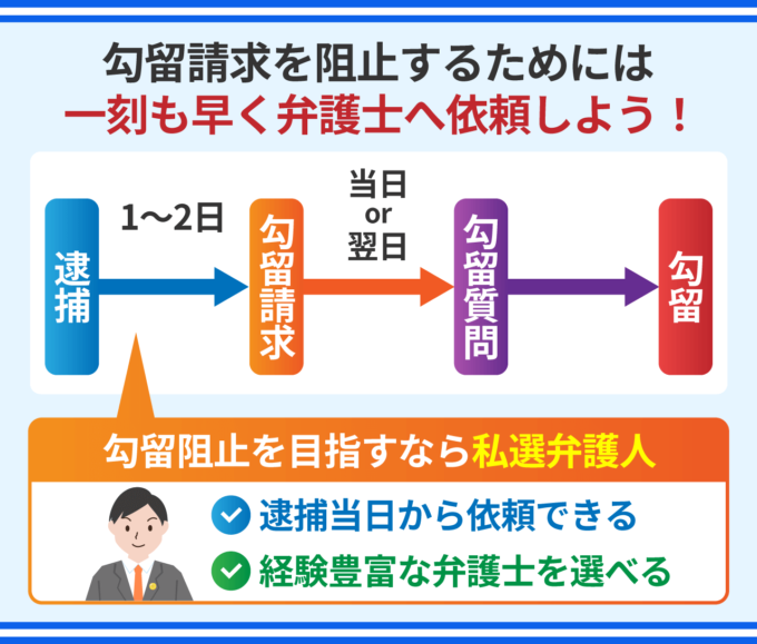 逮捕されてから検察官の勾留請求まで短い場合は1日、長い場合でも2日しかありません。そのため、勾留阻止を目指すのであれば逮捕当日に弁護士に依頼する必要があります。国選弁護人は勾留されてからのスタートになりますので、検討対象から外れます。