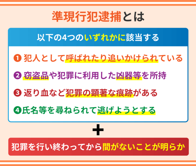 このタイプの現行犯人を逮捕することを準現行犯逮捕といい、現行犯逮捕と同じように扱われます。このページでは狭義の現行犯逮捕と準現行犯逮捕をまとめて現行犯逮捕と表記しています。