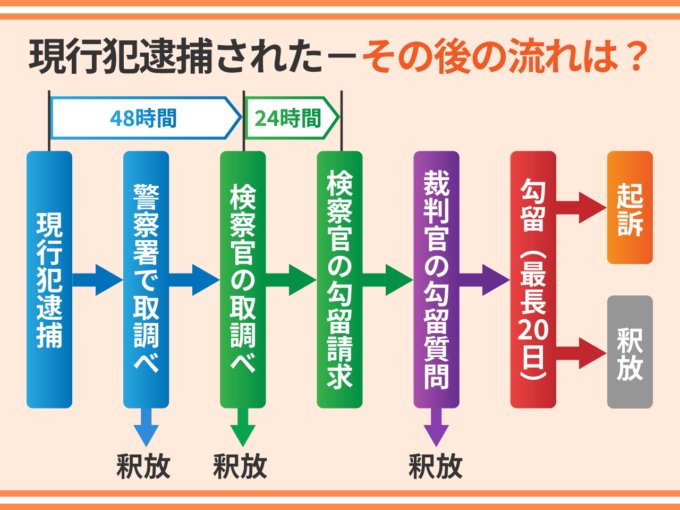 現行犯逮捕されると、警察官によって最寄りの警察署に連行され、すぐに取調べが始まります。その後の流れは通常逮捕された場合と同様です。