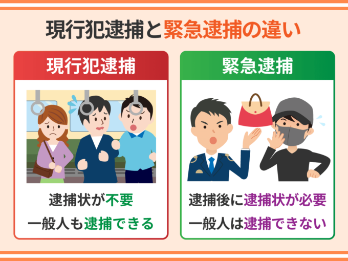 また、緊急逮捕する時点では逮捕状は不要ですが、逮捕後に速やかに逮捕状を請求し許可される必要があります。これらの点が現行犯逮捕との違いです。