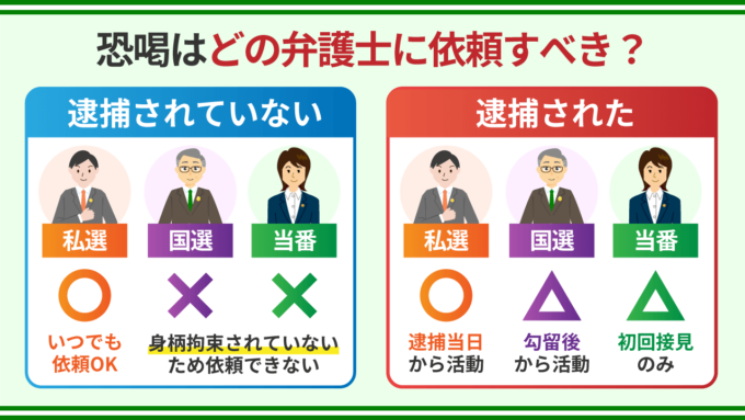 結論から言うと私選弁護人がベストです。私選弁護人であれば逮捕当日から呼べますし、依頼する側で恐喝に強い弁護士を選ぶこともできるからです。これに対して、国選弁護人を呼べるのは勾留後になりますし、弁護士を選ぶこともできません。