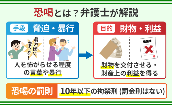 恐喝とは、脅迫や暴行を手段として、財物を交付させたり、財産上の利益を得ることです。財産上の利益とは、借金の免除やお金を払う約束をさせることです。