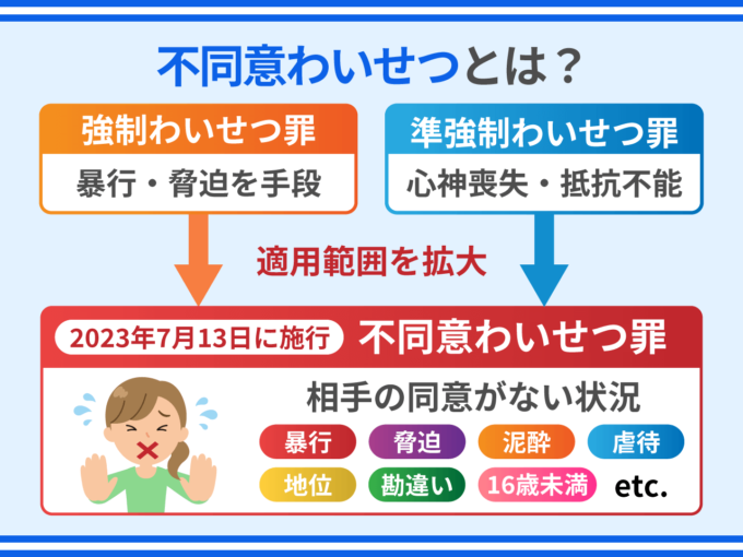 不同意わいせつ罪とは「同意がない状況でのわいせつ行為」を処罰する犯罪です。2023年7月13日以後の行為に適用される比較的新しい犯罪です。