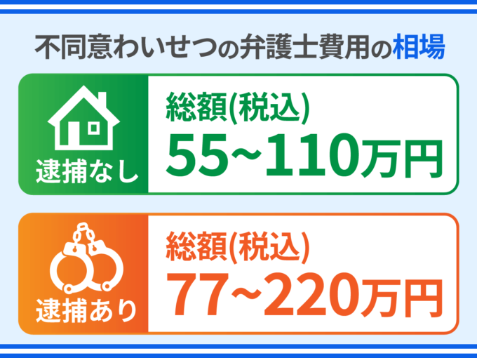 不同意わいせつの弁護士費用の相場は、逮捕されていないケースで総額55万円~110万円、逮捕されているケースで総額77万円~220万円になります(税込)。