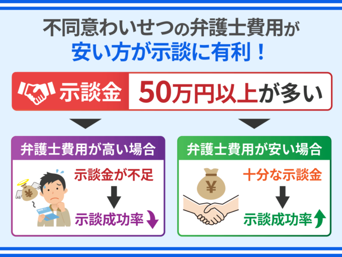 弁護士費用が高い事務所に依頼してしまうと、予算の多くが弁護士費用に消えてしまい、肝心の示談金を十分に準備できなくなるリスクがあります。弁護士費用が安ければ、それだけ示談金に割ける予算も多くなり、示談の成功率がアップします。
