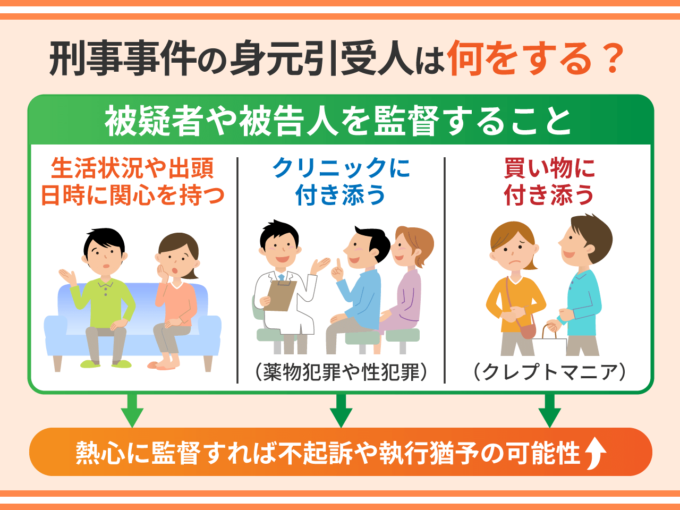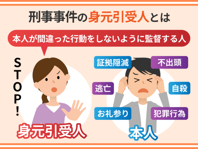 刑事事件における身元引受人とは、「本人が間違った行動をしないように監督する人」のことです。