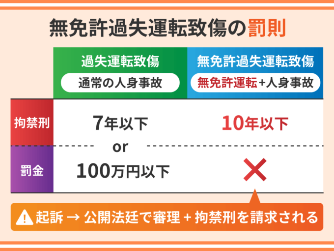 無免許運転+人身事故 | 無免許過失運転致死傷 | 10年以下の拘禁刑 |