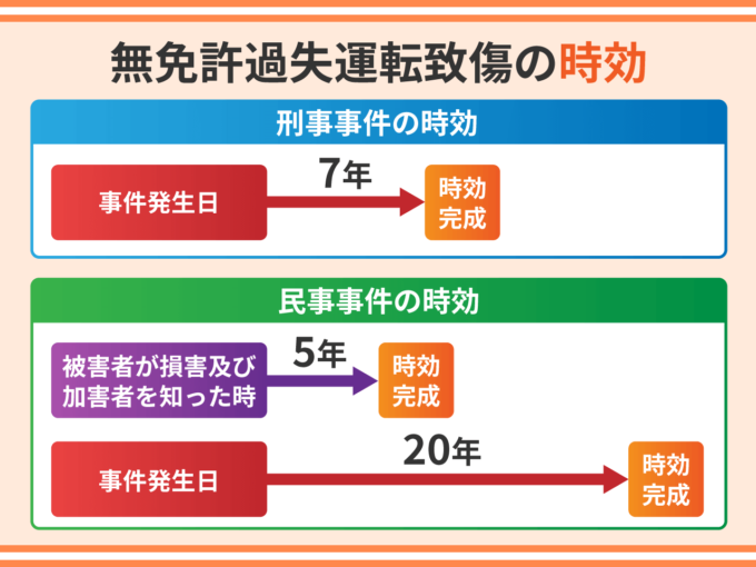 刑事事件の時効を公訴時効といいます。無免許過失運転致傷の公訴時効は事件発生日より7年です。7年を経過すると起訴することができなくなります。