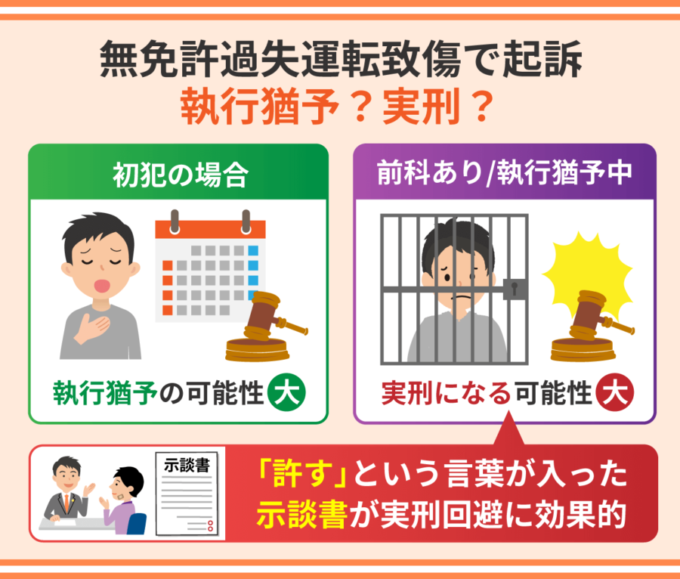 無免許過失運転致傷で起訴された場合は、初犯であれば執行猶予になる可能性が高いです。無免許運転など交通犯罪の前科がある場合や執行猶予中の場合は実刑になる可能性が高くなります。