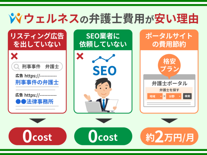 ウェルネスでは、SEO対策を内製化しており、リスティング広告やSEO業者を全く利用しておらず、ポータルサイトの費用も月額2万2000円しか発生していないため、弁護士費用が安くなっております。