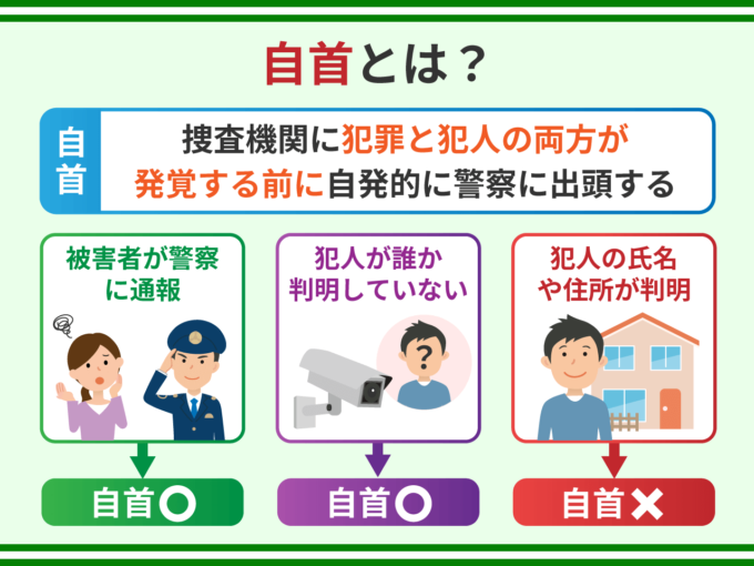 自首とは、犯罪と犯人が捜査機関に発覚する前に、自発的に警察に出頭し、自分がした犯罪について正直に話すことです。