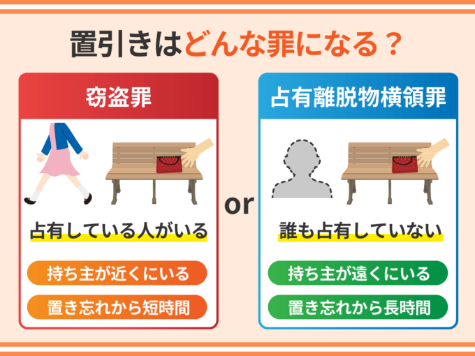 置引きのケースで窃盗罪になるか占有離脱物横領罪になるかは、「置引きした物を占有している人がいるか否か」によって決まります。