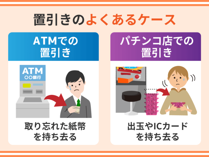 置引きでよくあるのがATMで前の利用者が取り忘れた紙幣を持ち去るケースです。取り忘れた直後でまだ被害者が同じ店舗内にいれば、被害者の現金に対する占有を侵害したとして、窃盗罪が成立する可能性が高くなります。