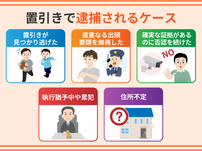 このような特徴から置引きは通常の窃盗に比べて悪質性が低いと判断されやすく、逮捕されることは少ないです。もっとも、以下のケースでは逮捕される可能性が十分にあります。