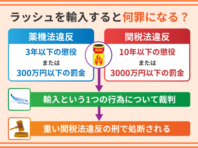 このようにラッシュを輸入すると薬機法違反と関税法違反の2つの犯罪が成立しますが、輸入という行為は一つですので、裁判になれば重い関税法違反の刑で処断されます。