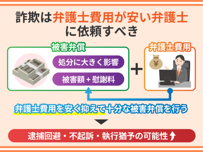 弁護士費用が安ければ十分な被害弁償を行うことができ、逮捕回避・不起訴・執行猶予の可能性を高めることができます。そのため、詐欺事件では弁護士費用が安い弁護士に依頼することがポイントです。