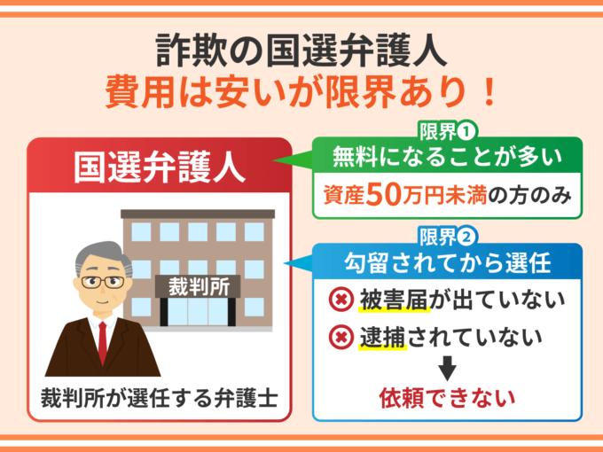 詐欺事件の対応を依頼できる弁護士のうち、最も弁護士費用が安いのは国選弁護人です。国選弁護人とは私選弁護人に依頼する資力がない方のために裁判所が選任する弁護人です。