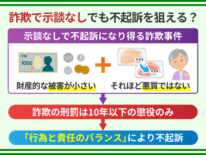 詐欺罪には拘禁刑しかないことから、軽微な事案については、検察官は被疑者に拘禁刑という重い刑を与えることを避けるため、示談なしでも不起訴にすることがあります。
