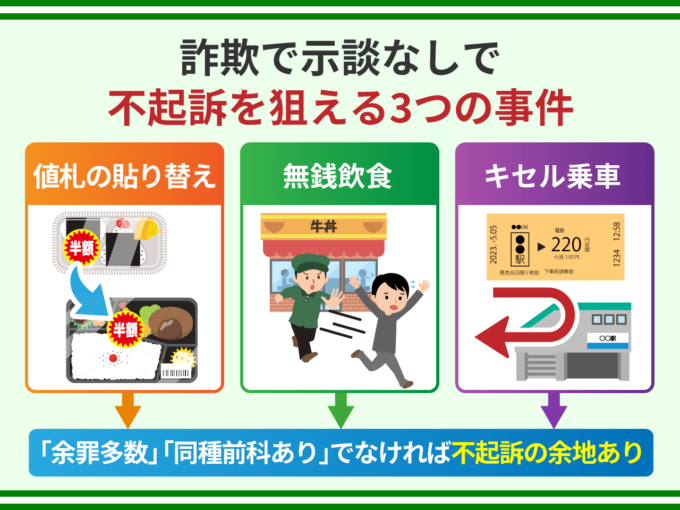 具体的には次の3つの詐欺では示談なしでも不起訴を狙えるでしょう。