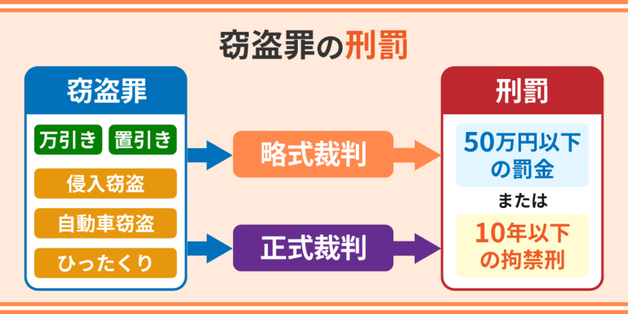 窃盗には万引きや置引きといった軽微なものから、侵入窃盗、自動車窃盗、ひったくり等悪質なものまで様々な手口があります。さまざまな種類の窃盗に対応できるよう、拘禁刑と罰金刑の2種類の刑罰があり、それぞれの刑罰にも幅があります。