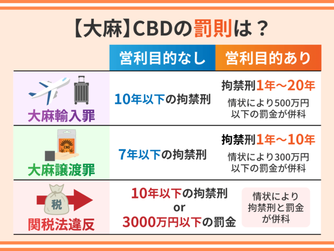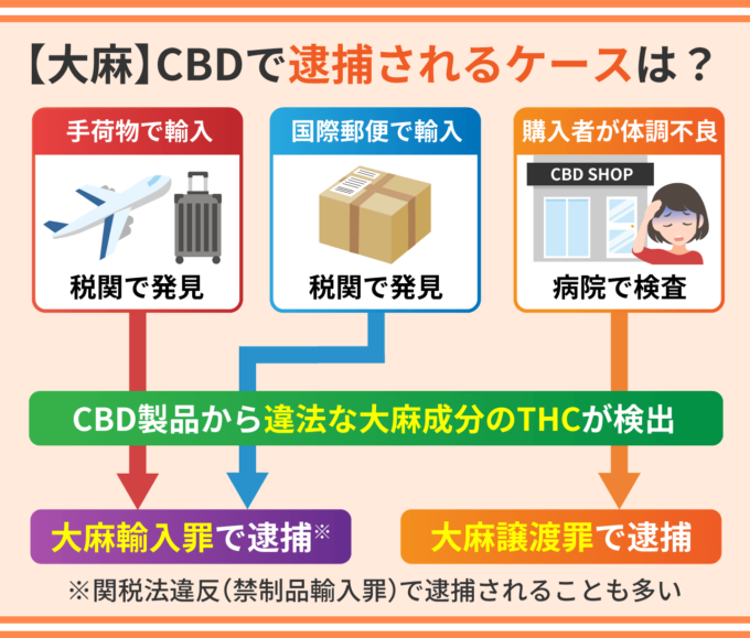 CBDは合法大麻として普及しているため、CBD製品を輸入したり販売しても逮捕されないように思えます。もっとも、CBD製品から違法な大麻成分であるTHCが検出されると、逮捕されることがあります。