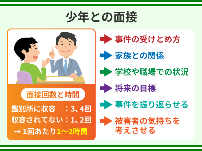 面接の回数は、鑑別所に収容されている事件では3,4回、収容されていない事件では1,2回になることが多いです。面接時間は1回あたり1~2時間です。