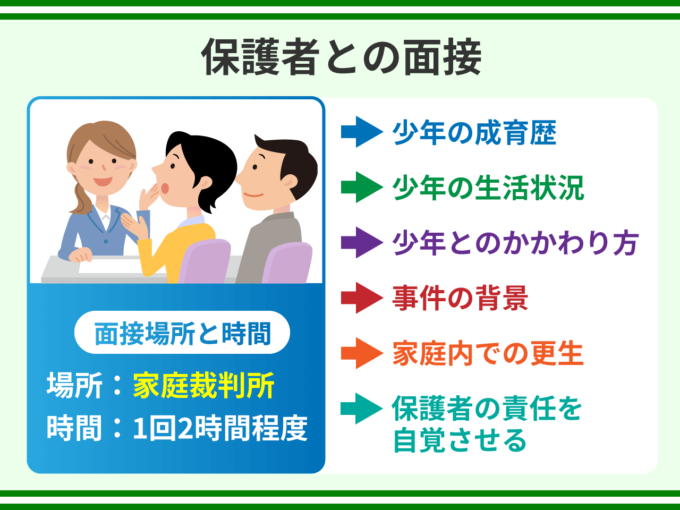 家庭裁判所調査官は保護者とも面接します。少年の生育歴や生活状況、保護者の少年とのかかわり方をヒアリングし、事件の背景や、家庭内での更生が可能かどうかを調査します。