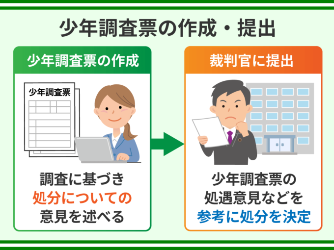 家庭裁判所調査官は、少年や保護者との面接、教育的措置、学校照会などに基づき、最終的な処分についての意見(「処遇意見」といいます)を書面にまとめて裁判官に提出します。この書面を少年調査票といいます。