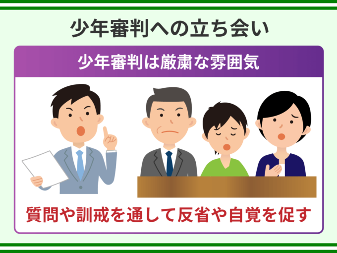 審判前の調査面接は話しやすい雰囲気で行われますが、少年審判では厳粛な雰囲気のなかで、調査官が少年や保護者に反省や自覚を促します。