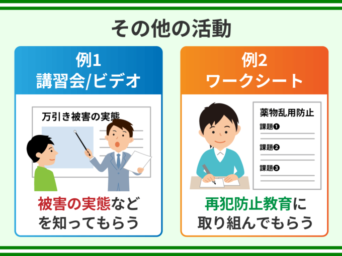 例えば、万引きの講習会では、店の従業員に来てもらい、万引き被害の実態などについて少年に話してもらいます。講習会の代わりにビデオ映像を見てもらうこともあります。