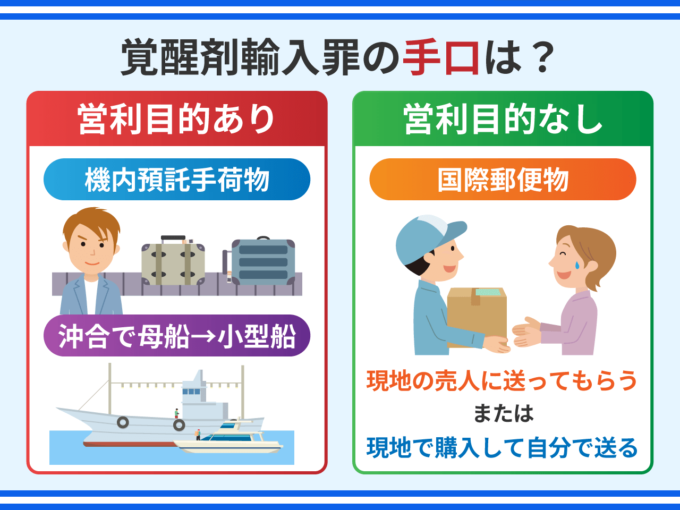 船で日本に持ちこむ場合は、暴力団が絡んだ大掛かりな輸入事案であることが多いです。「瀬取り」といって、沖合で母船から小型船に覚醒剤を積み変えて陸揚げする方式で輸入したり、コンテナ貨物に覚醒剤を隠匿して輸入することが多いです。