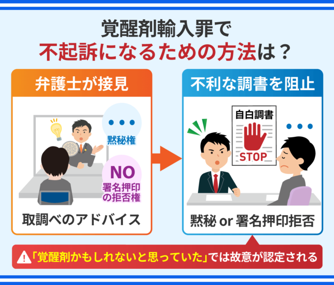 上で説明したように覚醒剤輸入罪で逮捕されたら、嫌疑不十分での不起訴を目指すべきです。嫌疑不十分で不起訴となるためには、捜査機関に不利な調書をとられないようにすることが必要です。