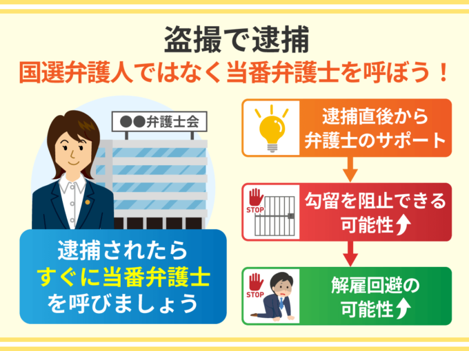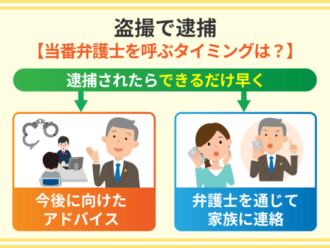 盗撮で逮捕されれば、できるだけ早く当番弁護士を呼ぶべきです。弁護士のサポートがなければ、早期釈放に向けて準備することができません。