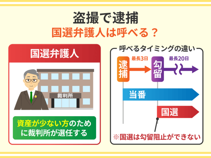盗撮(撮影罪)の身柄拘束は最長3日の逮捕⇒最長20日の勾留というステップで進みますが、国選弁護人を呼べるのは勾留された後になります。
