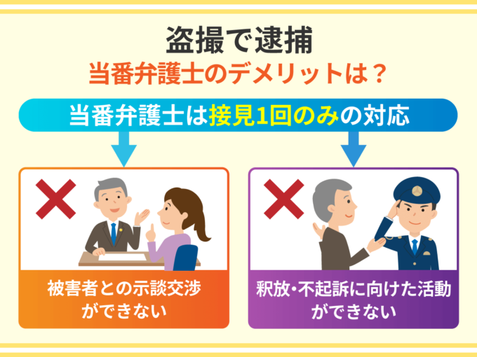当番弁護士の活動は初回の接見のみで終了するため、盗撮の被害者と示談交渉をしたり、早期釈放や不起訴を求める活動まではしてくれません。