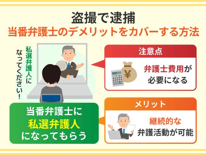 盗撮で逮捕された場合、当番弁護士に依頼して私選弁護人になってもらえば、逮捕中から勾留阻止のための弁護活動をしてもらうことができます。もっとも、私選弁護人になってもらうためにはそれなりの弁護士費用がかかります。