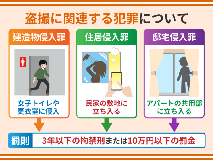 盗撮をするために女子トイレや女子更衣室に侵入した場合は、建造物侵入罪が成立します。入浴中の女性を盗撮する目的で民家の敷地に立ち入った場合は、住居侵入罪が成立します。盗撮目的でアパートの共用部に立ち入った場合は、邸宅侵入罪が成立します。