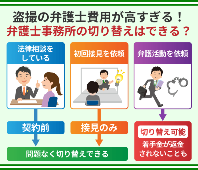 盗撮の弁護士費用が高すぎて払えない場合、弁護士事務所を切り替えることも可能です。切り替える場合のポイントについて段階ごとにわけて解説していきます。