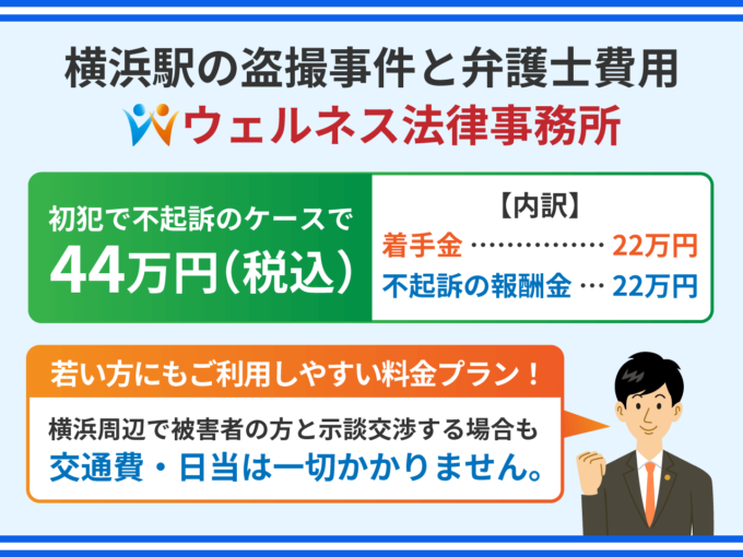 「横浜駅で盗撮事件を起こしてしまったが、出費をなるべくおさえて解決してもらいたい。」という方は、ウェルネス(03-5577-3613)にご相談ください。圧倒的な経験と実績で、不起訴獲得に向けあなたをフルサポートします。